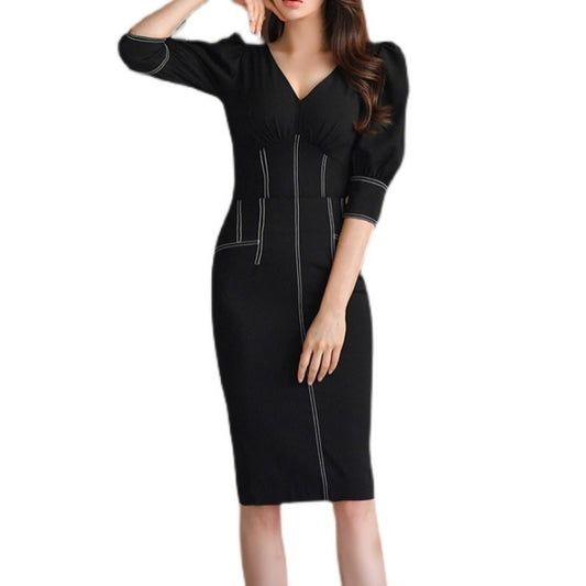 Women’s Elegant Pleated Black Dress – Slim Patchwork Style